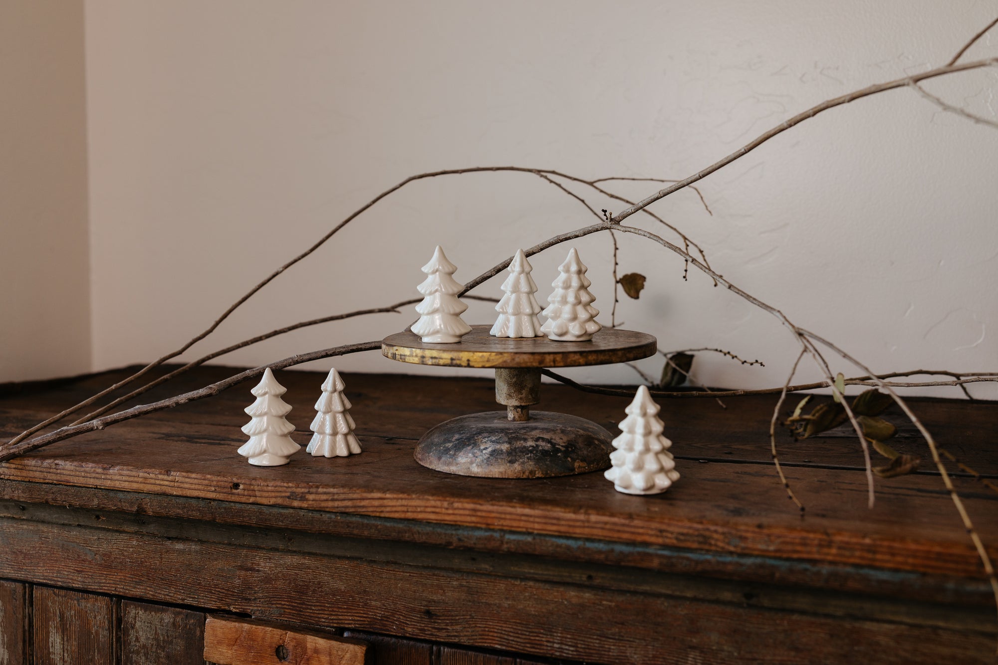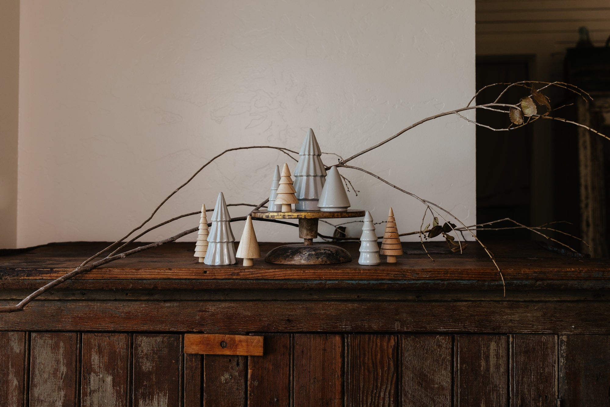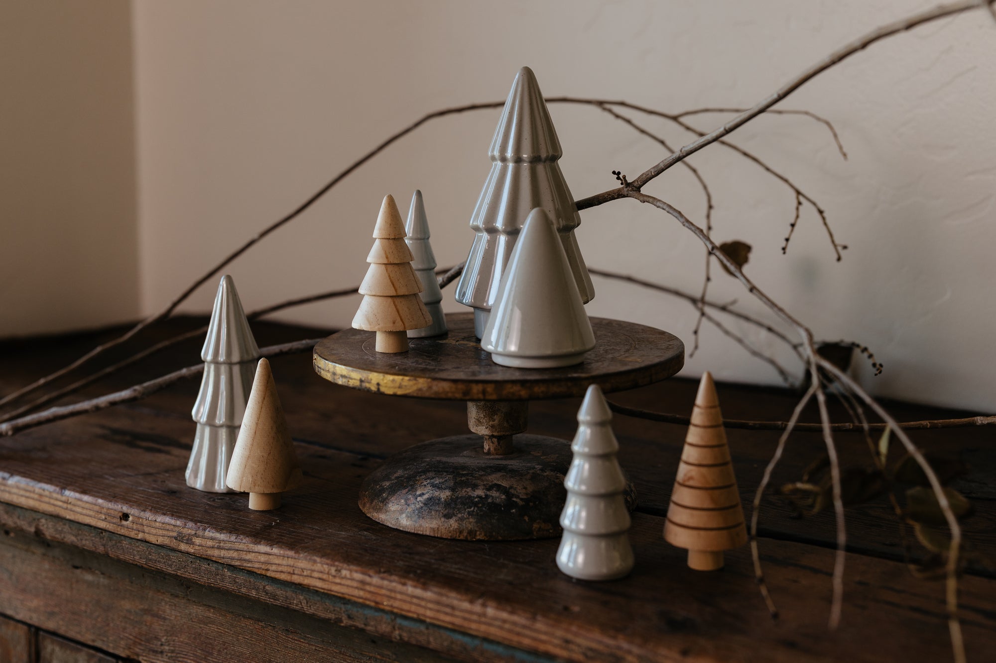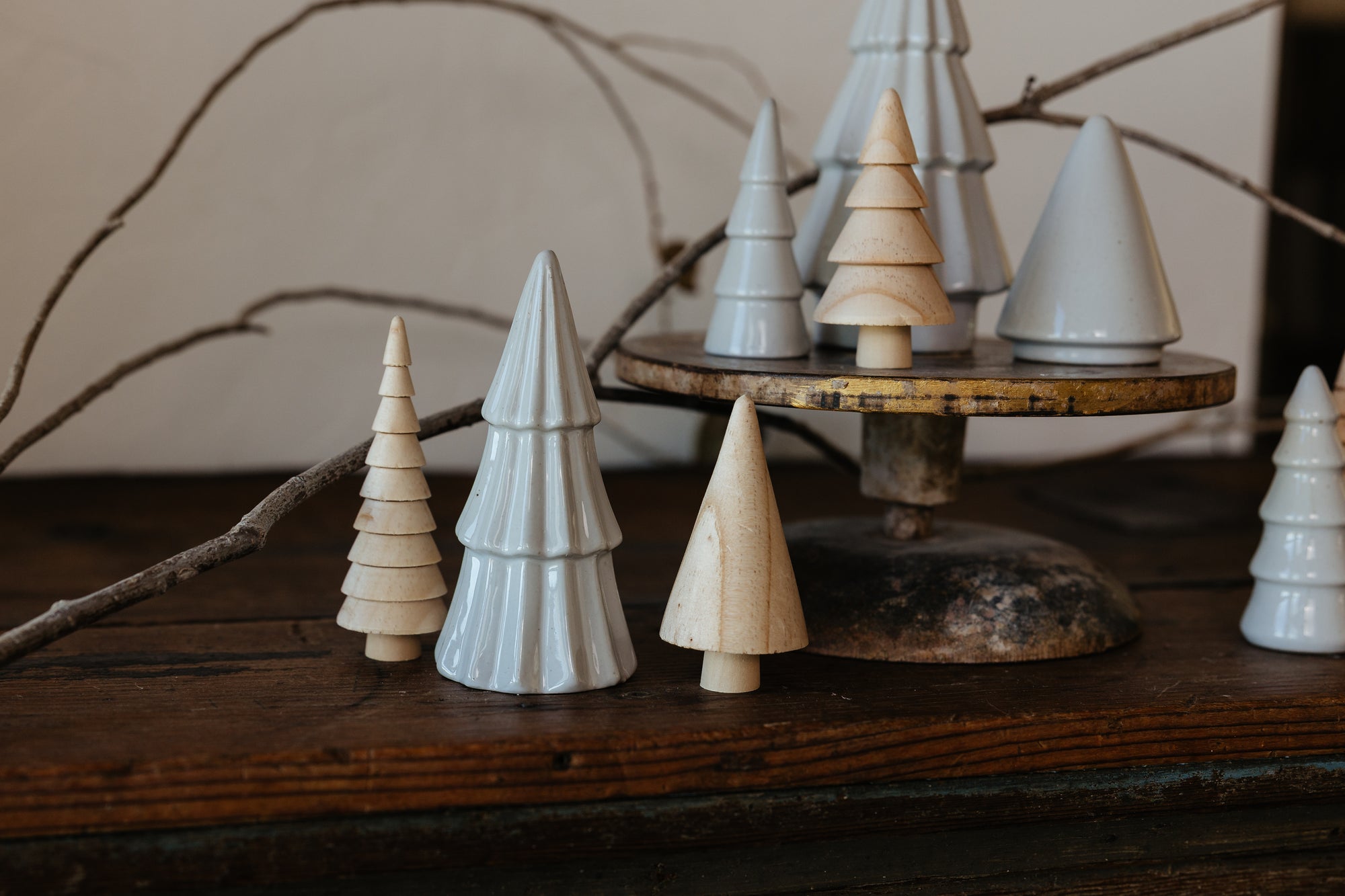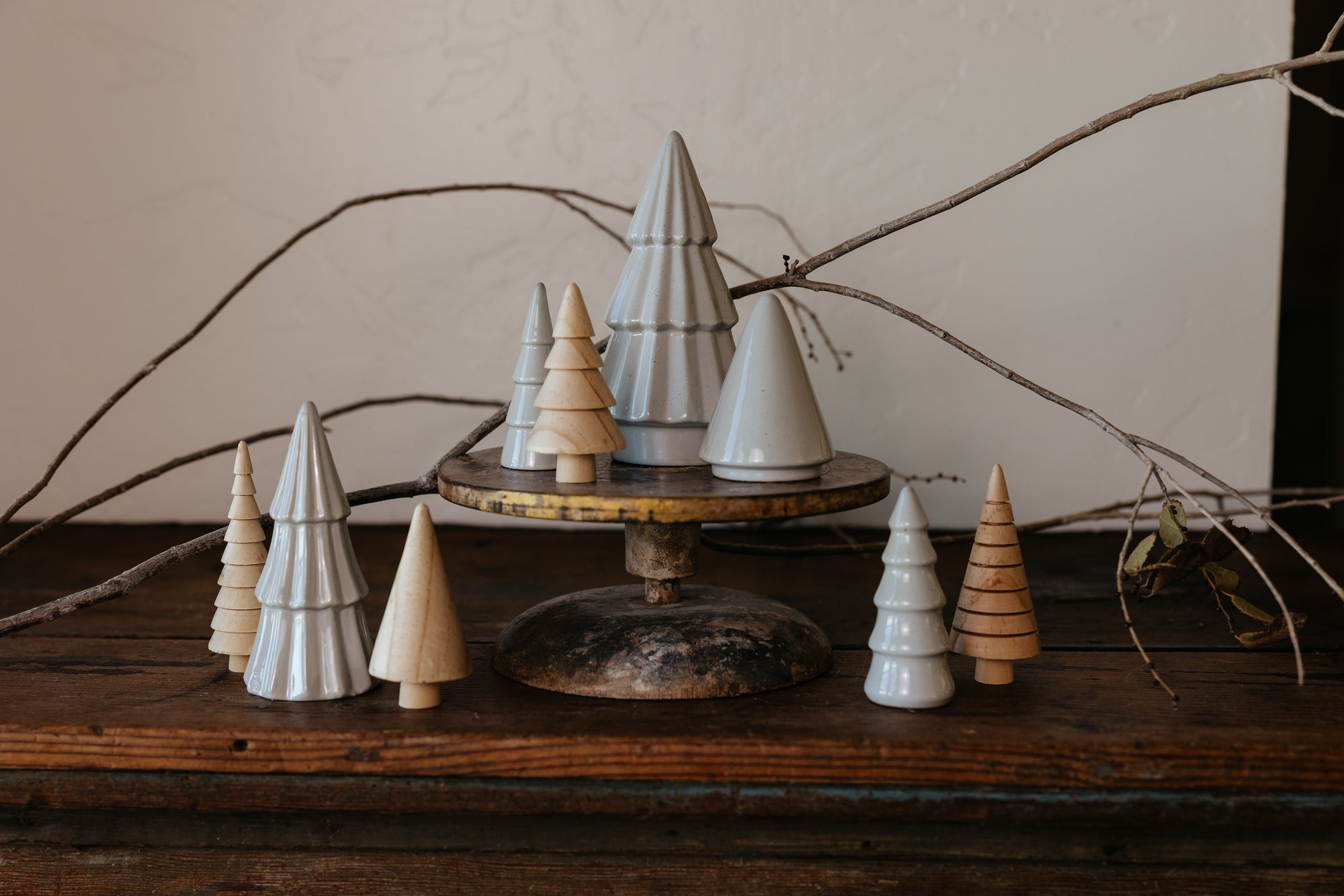 Set of 9 Stoneware and Wooden Christmas Tree Figurines