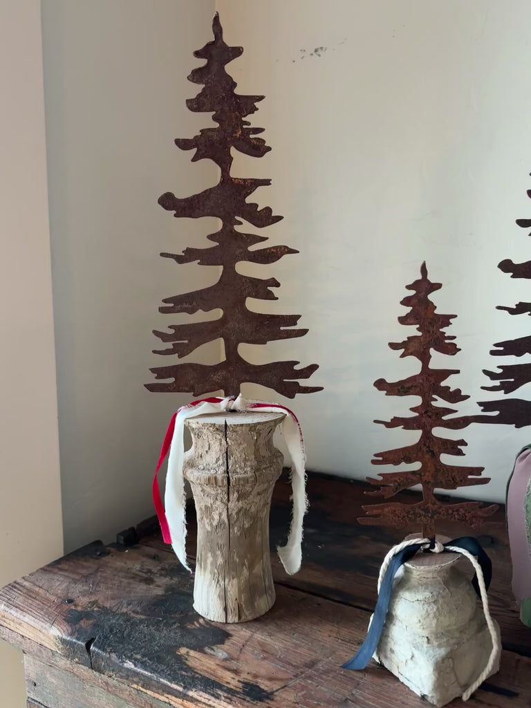 These trees are the perfect simple addition to you winter decor. Their salvage wood bases make then unique and give each one character. Tree is rusted metal with a salvage wood baluster or spindle base. Finished with silk and/or velvet ribbon. Enjoy them through the holiday and in the new year! Measurement includes total height of tree with salvage base.